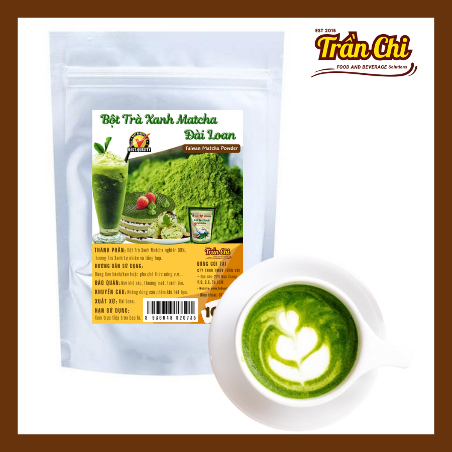 - Bột Trà Xanh Matcha Đài Loan - Gói 100gr là loại nguyên liệu nhập khẩu với hương vị đặc trưng đậm đà, thường được dùng làm các món bánh kem, bánh sinh nhật hoặc trà sữa. Sản phẩm có đầy đủ chứng nhận an toàn vệ sinh thực phẩm cũng như chứng nhận nguồn gốc rõ ràng.
